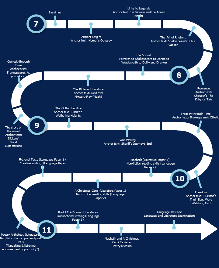 At KS4, we aim to offer students the opportunity to apply the skills from KS3 to the GCSE set texts. We consider a set of transferable skills (analytical, critical, evaluative, comparative) and teach literature and language texts discreetly in order to further progress these skills.